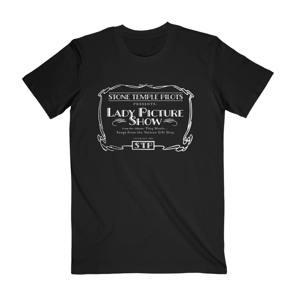 The Lady Picture Show Tee by Stone Temple Pilots is a black cotton tee featuring a design inspired by the band's Lady Picture Show music video from their 1996 album Tiny Music... Songs From The Vatican Gift Shop.